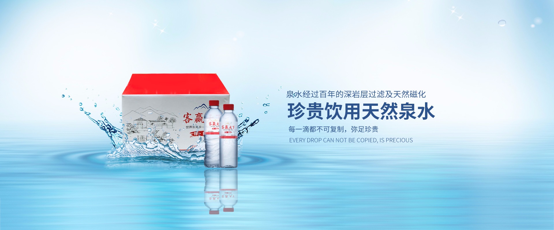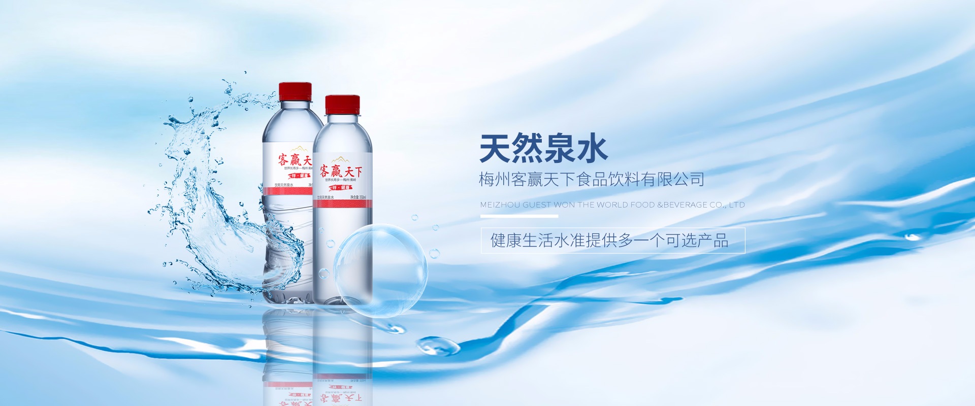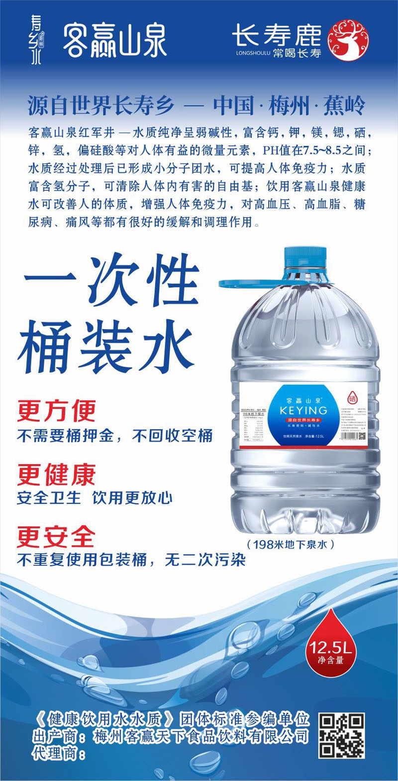 梅州客贏天下長壽水業有限公司是一家生產弱堿性天然飲用水的企業,位于第七個世界長壽鄉--蕉嶺華僑農場北坑村五馬山,水源天然純凈含多種礦物質微量元素,是健康的好水?,F為珠海各機關單位、協會、商會、企業單位舉辦高端會議及活動送上一份真誠的祝福和溫馨的問候。